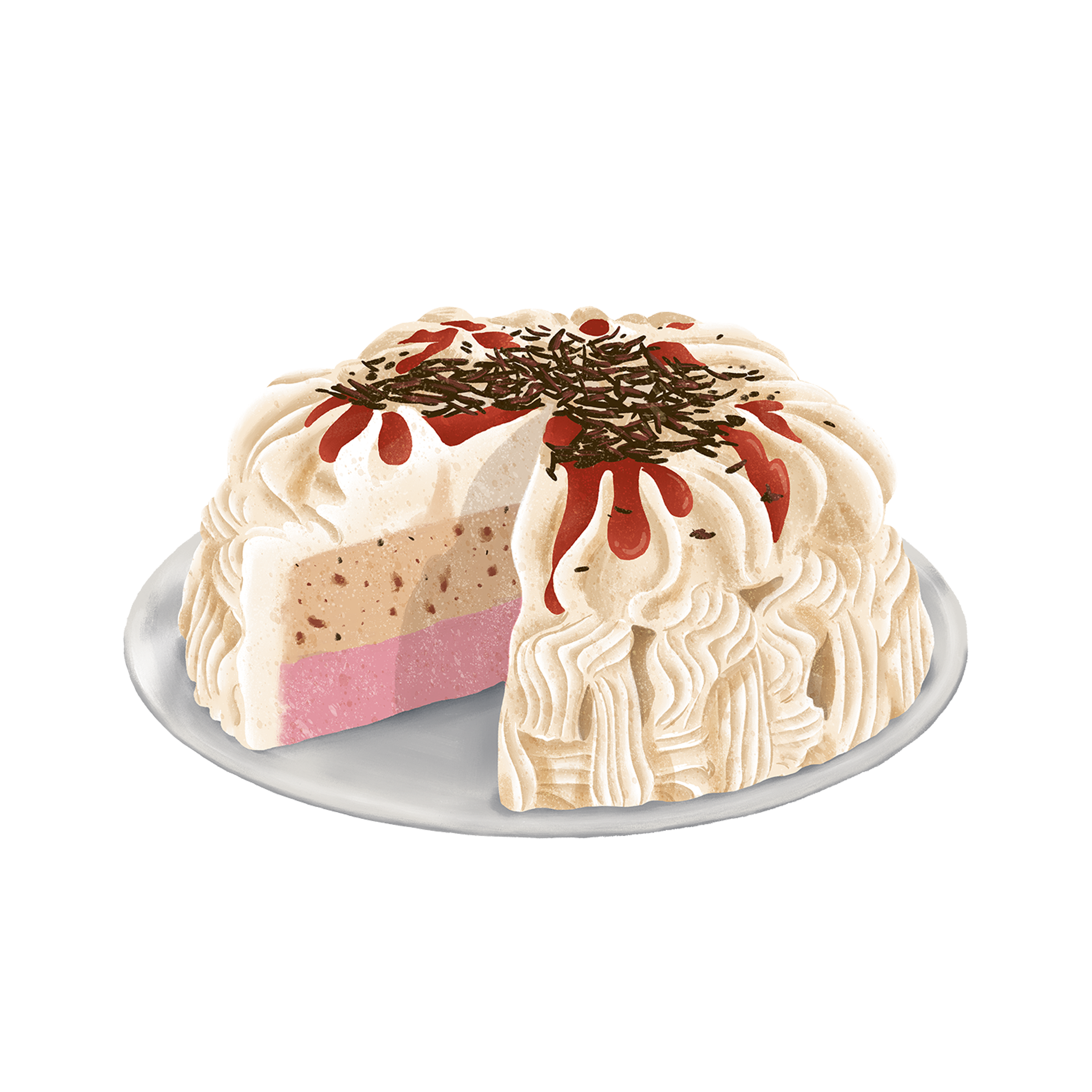 Islagkage med kirsebærflødeis og vaniljeis samt pyntet med konfekturerose